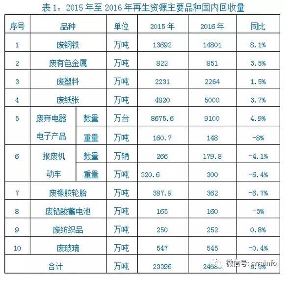 1、回收量。在宏观经济形势总体下行的背景下,再生资源回收行业总体规模不但没有出现大幅下滑,而且有了一定幅度的增长。据中再生协会统计显示,2016年,废钢、废有色金属、废塑料、废纸、废弃电器电子产品、报废汽车、废橡胶轮胎、废铅酸蓄电池、废纺织品、废玻璃等10个主要品种国内回收量2.47亿吨(见表1),比2015年同比增长5.5%。