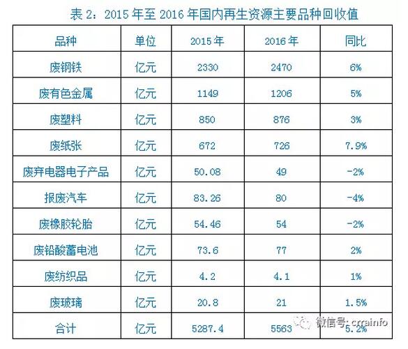 2、回收值。2016年,废钢、废有色金属、废塑料、废纸、废弃电器电子产品、报废汽车、废橡胶轮胎、废铅酸蓄电池等10个主要品种国内回收值5563亿元(见表2),比2015年同比增长5.2%,扭转了近几年回收值连续大幅下滑的趋势,实现了一定增长,提示着再生资源行业开始进入初春。