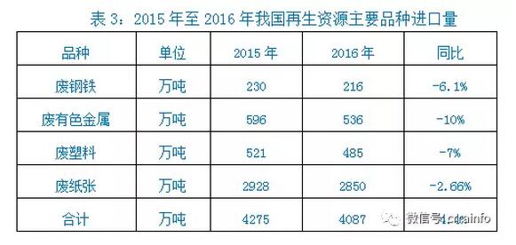 3、进口量。2016年,我国废钢铁、废有色金属、废塑料、废纸4个品种的进口量达4087万吨,比2015年同比下降4.4%(见表3)。进口量同比下降的原因,是环保监管趋严,国家收紧固废进口政策。