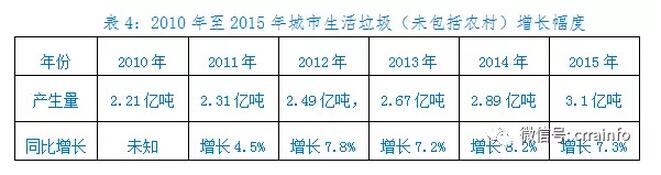 4、近五年全国城市生活垃圾增长幅度。中再生协会专家组通过实地调研及查阅相关部门资料发现,2010年,全国城市生活垃圾产生量2.21亿吨,到2015年,全国城市生活垃圾产生量增长到3.1亿吨,5年间城市生活垃圾平均年增长7.54%,其中2014年比2013年同比增长8.2%(见表4)。