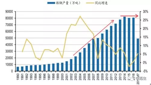 粗钢产量达到顶峰,增长面临停滞。21世纪以来,伴随着工业化和城市化进程的加速,我国钢铁工业持续高速发展,2000-2013年钢铁产量的平均增长速度高达14.2%,而世界平均水平仅5.2%。2014年,我国粗钢产量达到峰值8.23亿吨。其后的2015-2016年,我国的粗钢产量均在8亿吨左右。随着国内经济结构的深化调整,产量长期增长的顶峰期已过,粗钢产量的增长面临停滞,钢铁行业也步入调整期。