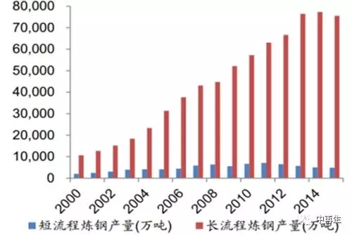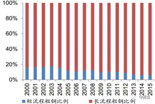 我国粗钢生产以长流程为主,短流程炼钢工艺没有得到有效开发。截至2015年,我国短流程炼钢产量仅为4880万吨,占比仅为6.07%。从产量来看,根据统计,2000年以来,我国短流程粗钢产量远远低于长流程粗钢产量,2015年短流程炼钢产量仅为4880万吨,而长流程炼钢产量则高达75500万吨;从产量结构来看,2010年以来,短流程占比呈下滑趋势,2015年仅为6.07%。因此可以看出以往我国粗钢的生产主要以长流程为主,短流程炼钢工艺没有得到有效开发及推广,致使短流程粗钢产量及其占比都比较低。