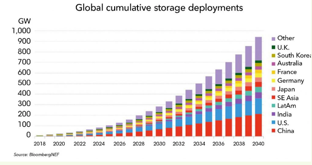 图1. 2018年至2040年全球累计部署的锂离子电池储能系统装机容量(单位:GW)