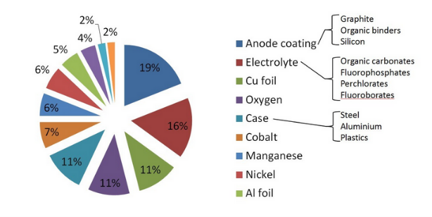 从电池回收工艺的角度来看,由于锂离子电池原料的高度异质性,与传统的金属资源回收相比,锂离子电池的回收面临独特的挑战。目前,市场上的锂离子电池至少存在14种不同类型的阴极材料,当考虑特定成分时,每种阴极材料都有所不同。对于传统的金属资源,采用主要回收措施可能回收1到4种金属元素(例如铜、金、银和铂等)。但是,锂离子电池可能需要考虑回收利用20多种元素,如图3中的元素组成。另外,这些金属元素通常与无机材料、有机材料和塑料(7420, 5.00, 0.07%)混杂在一起,这进一步使锂离子电池的回收过程复杂化。为了能够分离出有价值的成分,通常需要具有许多单独单元操作的复杂工艺流程图。在这种情况下,电池回收工艺流程进行的物理测试工作是非常关键的,并需要通过技术和经济来驱动。