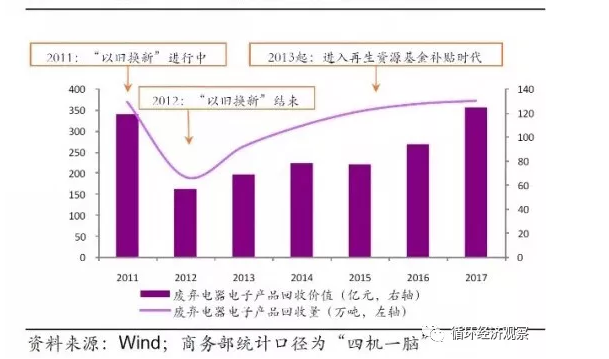 爆发期:2009年6月家电以旧换新政策发布,采用补贴消费者、回收机构、处理企业的方式,促进消费者购买家电并交投废旧家电,从而起到促进家电行业发展、拉动内需的效果。历时2年多,共销售四机一脑9248万台,回收9528万台,对电子废弃物行业影响深远。