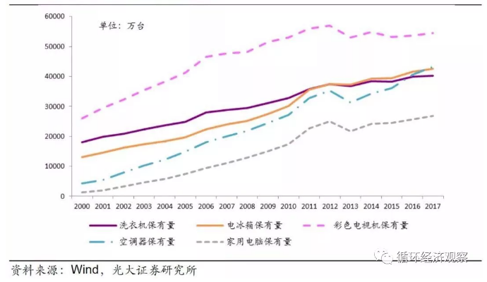 根据国家统计局提供的城镇或乡村每百户耐用品拥有量数据,我们分别测算出四机一脑的城镇、乡村保有量,加总得到保有量总量。