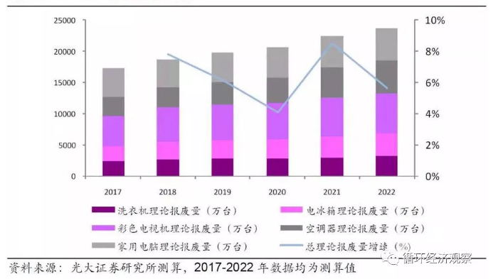 测算结果:预计到2022年,四机一脑理论报废量总计2.37亿台,其中电视理论报废量0.64亿台,冰箱0.36亿台,洗衣机0.33亿台,空调0.53亿台,电脑0.51亿台。