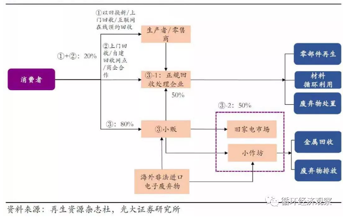 约50%的废弃电子物流入非正规企业,归根结底还是回收渠道的问题。目前正规回收处理企业的电子废弃物来源有三类:直接从消费者手中回收、从生产商或经销商手中回收、从小贩手中回收。其中,走街串巷的小商贩掌握了80%的废弃物来源,他们中有些卖给正规企业,大部分却卖给了非法小作坊或者二手市场,带来环境污染危害与安全隐患。前端回收环节依赖小商小贩,正规军参与度不高是电子废弃物流入非法渠道的根源。