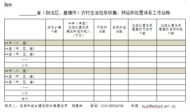 (三)建立工作台账。省级住房和城乡建设部门要定期汇总市(州、盟)、县(市、区、旗)收运处置体系建设与运行情况,填写本地区工作台账(见附件),每半年报我部村镇建设司。我部将根据各省(区、市)上报的工作台账,结合全国村镇建设统计、第三方机构现场核实数据,评估各地工作情况。