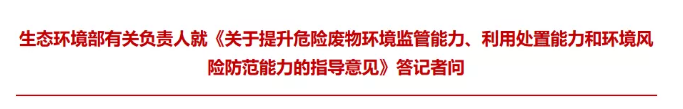 近日,生态环境部印发了《关于提升危险废物环境监管能力、利用处置能力和环境风险防范能力的指导意见》(以下简称《指导意见》)。生态环境部有关负责人就《指导意见》出台的背景、目标、环境监管体系如何建设、利用处置能力如何强化、环境风险如何防控等内容,回答了记者的提问。