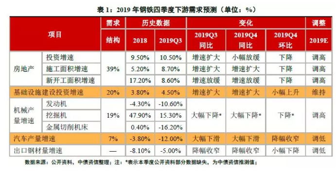 四季度,基建、房地产投资仍为钢铁行业主要的需求增长点,基建投资增速或继续小幅上行,汽车增速降幅预计收窄,但房地产投资增速环比继续回落,带动四季度钢铁需求较三季度增速小幅收窄。考虑房地产全年投资增速韧性较强,2019年钢铁全年需求增速预计高于年初预期,同比增长8%~10%。