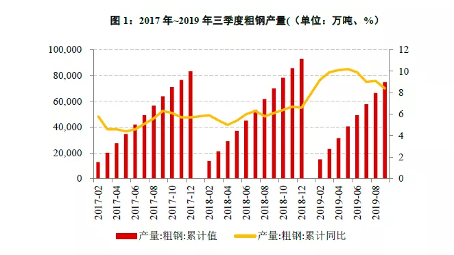 2019年三季度,从行业下游需求看,虽然汽车销量持续大幅下滑趋势、部分机械产量大幅下滑、钢材出口价格优势走弱导致出口继续边际下滑等因素对钢铁的消费形成拖累,但主要需求端房地产施工面积增速仍同比保持良好增长,加之基础设施建设投资增速表现稳中有升,行业整体需求仍保持同比增长。三季度粗钢产量累计同比增长8.4%,但增速较二季度放缓1.5个百分点。