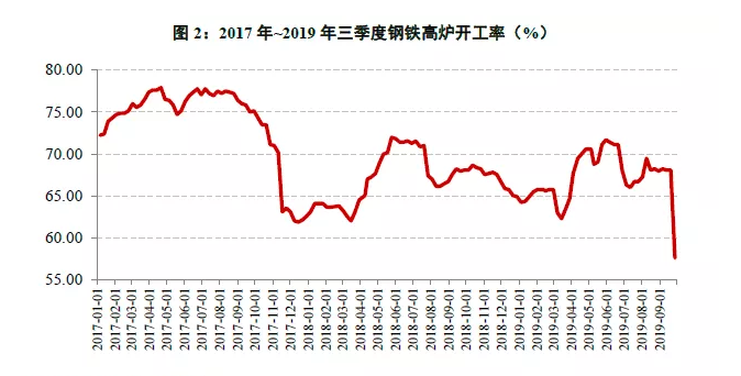 2019年三季度,行业产能无重大变化。开工率方面,受下游季节性停工,唐山、邯郸等地启动新一轮环保限产,国庆前环保停产力度较大,叠加部分企业开展超低排放改造的影响,行业整体开工率有所下降,7~9月平均开工率[1]约66.8%,同比下降1.3个百分点,环比下降3.2个百分点。