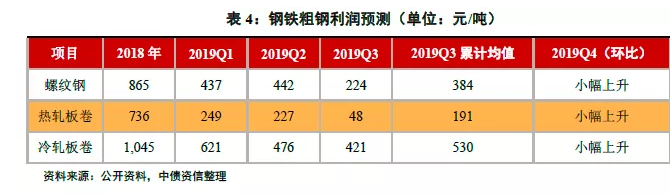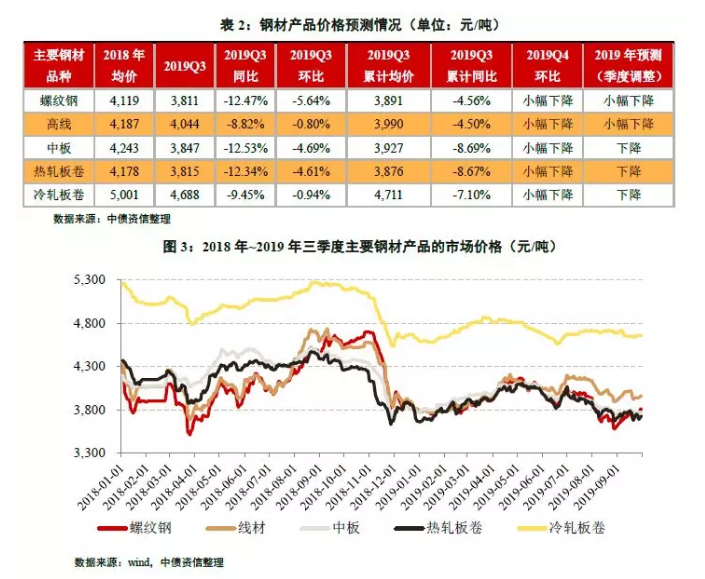 四季度,需求端增速受房地产增速下行影响环比放缓,但考虑到行业整体供给力度将随着冬季环保限产出现下降,四季度行业供需格局较三季度小幅优化,但从成本端看,四季度铁矿石受到岸量恢复及下游需求放缓影响较三季度均价有较明显的下降,从而拉动钢材价格较三季度有一定程度的下滑,其中板材受机械和汽车需求不足影响,价格降幅仍或大于线材。2019年全年钢材价格总体保持年初预期,预计降幅在2%~8%范围内。