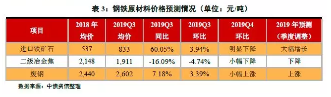 受年初溃坝事故波及矿山的产量以及夏季台风天气影响,本年度以来进口铁矿石供给偏紧的现象未有明显改观。虽然8、9月铁矿石到港量恢复明显,但受7月高均价影响三季度铁矿石均价仍呈小幅上涨趋势,季度均价环比上涨3.94%,同比大幅上涨60.05%。冶金焦供给总体宽松的情况未有明显变化,季度均价环比小幅下跌-4.74%,同比下跌16.09%。废钢方面,价格环比小幅上涨3.39%,同比上涨7.18%。行业整体原材料成本上涨明显。
