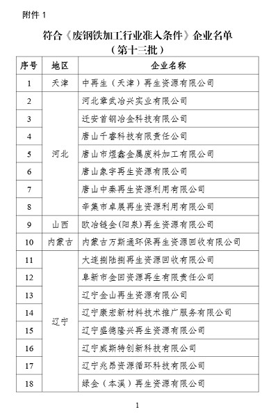 1. 符合《废钢铁加工行业准入条件》企业名单(第十三批)