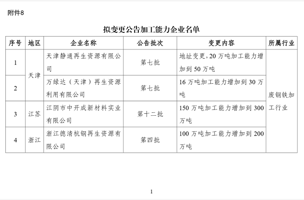 按照《废钢铁加工行业准入条件》等规范条件及相关公告管理办法要求,现将拟公告的符合《废钢铁加工行业准入条件》企业名单(第十三批)、符合《废铜铝加工利用行业规范条件》企业名单(第二批)、符合《废纸加工行业规范条件》企业名单(第四批)、符合《废塑料综合利用行业规范条件》企业名单(第九批)、符合《废旧轮胎综合利用行业规范条件》企业名单(第六批)、符合《机电产品再制造行业规范条件》企业名单(第二批),以及拟变更公告名称、变更公告加工能力和撤销公告的企业名单予以公示。如有异议,请在公示期内将书面意见反馈至工业和信息化部节能与综合利用司。