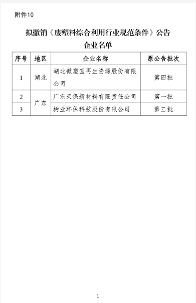 10. 拟撤销《废塑料综合利用行业规范条件》公告企业名单