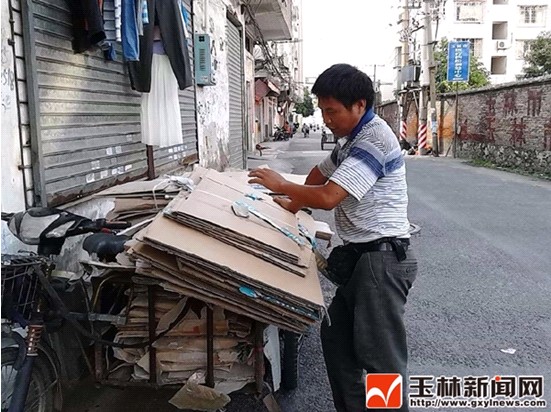 7日下午,接到一个顾客电话,称要卖废纸,“破烂王”老刘轻快地骑着电动车出发。一两个小时后,老刘满载着一车废纸品、泡沫回到自己的收购店,脸上挂着笑容。他告诉记者,这种“送上门”的生意可遇不可求,远比自己盲目地在玉林城区转悠收购强。