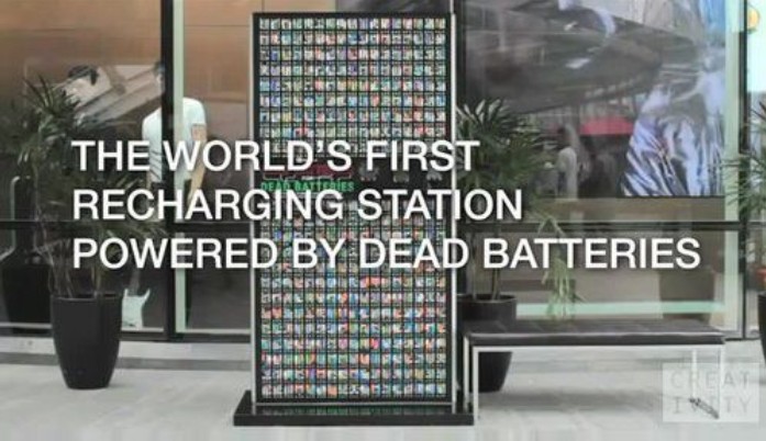 另一方面,对于普通的碱性电池,人们通常会在觉得在电力不足后将其丢弃,殊不知平均每节废弃碱性电池的剩余电量可达到400毫安。那些所谓的废旧电池并不是真的一点电量都没有,它只是因为剩余电量太少不够支持收音机或者遥控器而已,积少成多的话,这些电池还能够继续发挥大作用。最近,泰国的饮料商Vitamilk 就非常有创意的利用废旧碱性电池搭建了免费的手机充电站,不仅为智能手机用户免费充电,同时还巧妙的传达了自己产品补充能量的理念。