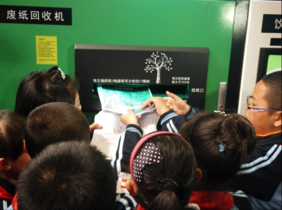 "环保小卫士"们将废纸投入智能回收机
