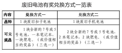 “有奖兑换”活动方式共分三种。其一,面向中小学生开展“有奖兑换”活动方式及流程。在城区中小学校的每个班级分别设立一个绿色环保箱(废旧电池收集箱),学生收集废旧电池到所在班级办理“有奖兑换”事宜。即:学生收集废旧电池到所在班级登记后投入班里的绿色环保箱(废旧电池收集箱),由班主任负责废旧电池回收的记录及向学校领取奖品兑换给学生,每星期兑换一次。