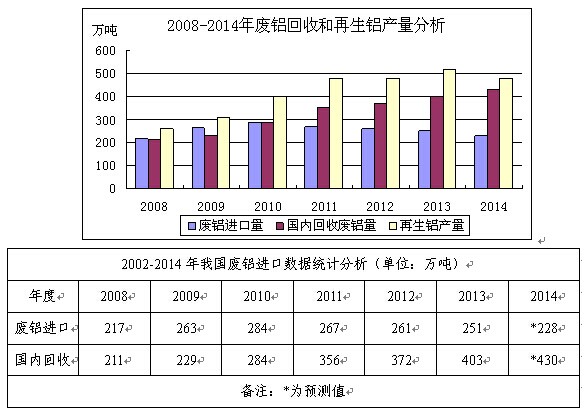 2010年之前,国内回收的废铝总量虽不及进口废铝量,但隐隐已有赶超之势,2010年之后,随着废铝进口量的下降,国内回收的废铝数量却在稳步上涨,2013年甚至已经超过400万吨。数据分析显示,2013年,我国废铝原料来源中38%左右依靠进口,而62%是由国内产生的,其中包括国内回收的废铝以及生产环节产生的新废铝和铝渣。