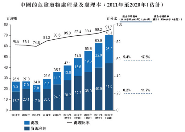 中国有两种主要最终危险废物处理方法,分别为资源利用及处置。资源利用处理方法会循环再用并从危险废物中抽取有价值的成份,如贵金属。处置则用于无用废物或并无其他可用的处理方法的废物,目标为清除或减少废物的危险特性以尽量降低其对环境的影响。填埋及焚烧为中国最普遍的两个处置方法。于进行最终处理前,可能需要按危险废物的性质进行多个处理前程序,如物理化学方法、固化或稳定程序。本节有关危废量的数据及讨论涵盖于中国生产、处理及处置的危废总量。有关危险废物设计处理能力的数据及讨论仅专注于独立公司运营的危废处置设施,如集中化危废处置设施。