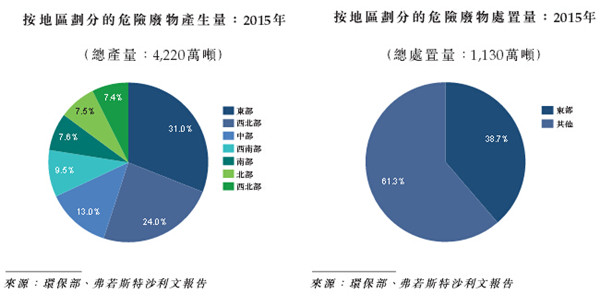 根据弗若斯特沙利文的资料,中国的危险废物产生量与处理能力分布不均,使缺乏危险废物处理设施的地区具备危险废物处理行业的增长机会。位于中国东部及中国西北部的工业化地区占危险废物产生量的一大部份。经济发达地区如华东及华南占危险废物处理能力的一大部份。而我们的危险废物处置项目主要位于华东地区。下图载列2015年中国危险废物的地区产生量及处置量:
