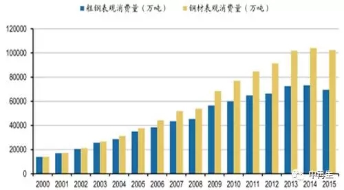 2000-2015年粗钢和钢材表观消费量变化