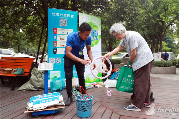 “不急,我们要等到11点才离开。”李明哲答道。李明哲是上海昉昫环保科技有限公司的副总经理,从去年起,他们就开始了小区定时定点垃圾回收业务,对宝山区庙行镇一片的小区熟门熟路,与居民们也建立了邻里般的交情。每周六9点到11点,若不下雨,李明哲都会出现在这个小区,收集居民们送来的可回收物。“最近放暑假了,书本、卷子的回收量增加。梅雨季,大家喝的水多了,饮料瓶回收量也很可观。”