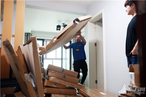 下单居民家里正在装修,地上放着许多大大小小的家电包装盒。