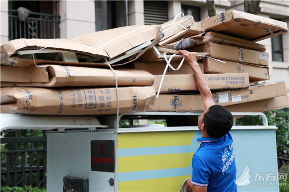 从居民家离开,李明哲费了一番功夫把几十个包装盒装进电梯,再塞进回收车。“可回收物大多比较占面积,你去我们中转站看看就知道了。”跟随着回收车,记者来到了庙行镇两网融合中转站。