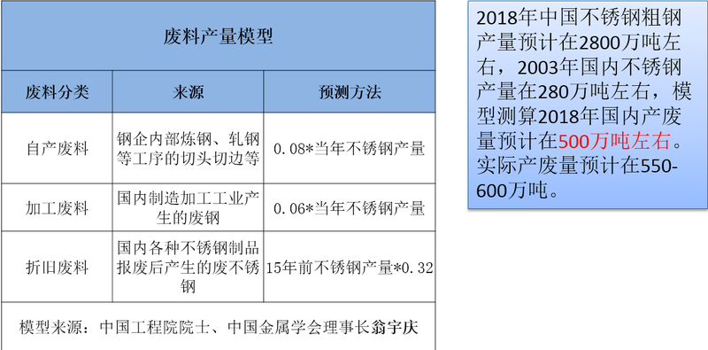 国际不锈钢界通常认为不锈钢从粗钢到钢材的综合成材率为85%~88%,考虑到生产过程中会有部分不锈钢进入到粉尘、废渣、酸洗泥中,生产商在不锈钢生产中可回收的废钢至少应当有10%。不锈钢制品制造或工程建设过程中产生的废钢,是很难测量和统计的。我国认为,根据有关行业不锈钢加工贸易复出口率的核定标准一般在65%左右,考虑大块边角料回收再利用65%左右,可以产生11%左右的不锈钢废钢。这一数据与国际上的通行看法非常相近。虽然我国在不锈钢生命周期结束后,回收的废不锈钢资源以前较少,但以不锈钢平均生命周期为15~25年测算,每年也有20万吨以上。