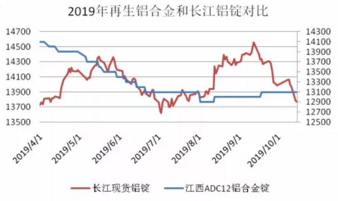 从表中可以明显看出,9月中旬以来电解铝价格的下跌,并未使得再生铝合金价格下调,部分企业因为库存跟不上,甚至出现上涨的情况,9月中旬,江西地区铝合金锭价格在1.3万附近,相较于成品铝锭的下调,反而增长了100元/吨,目前在13100元/吨附近。
