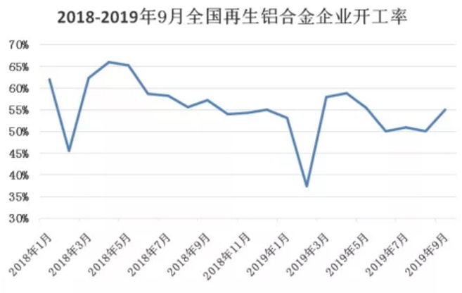 从开工率方面来看,虽9月旺季影响下,再生铝企业开工率略有回升,但幅度不明显,据了解,2019年9月我国再生铝合金企业开工率在55%附近,仍处在低位,主要还是受到了废铝原材料难寻、低价货源稀少,企业利润收窄的影响。