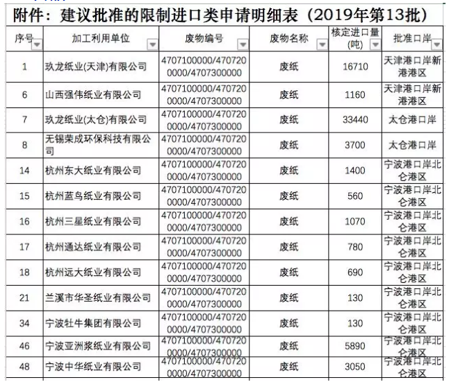 2019年10月17日,固废中心公布的2019年第13批限制进口类申请明细表显示,