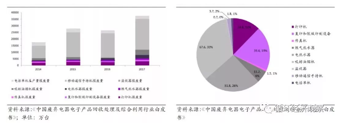2014年新版《废弃电器电子产品处理目录》在四机一脑的基础上加入了打印机、电热水器、手机等9类产品。2017年这些新增产品年报废量3.74亿台,报废重量约200万吨,亟待规模化、规范化回收,因此未来有望将新增产品也纳入基金补贴范围。