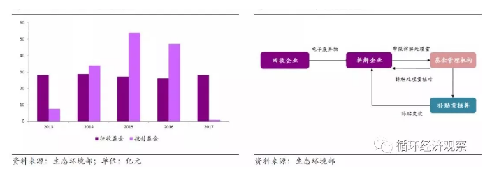 废弃电器电子产品处理基金赤字严重,2016年赤字超20亿元,目前近百亿元。长期的处理基金发放过程显著降低了补贴的使用效率,企业申报后需经省级环保主管部门审核并上报环保部,环保部核实后提交财政部,最后由财政部支付资金,有些企业在申报一、两年之后都没有拿到补贴。资金短缺与补贴发放滞缓导致许多企业被迫缩减产量或者对外寻求贷款。