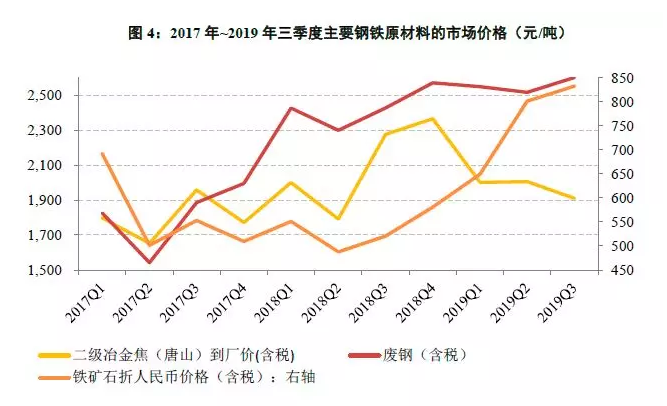 受年初溃坝事故波及矿山的产量以及夏季台风天气影响,本年度以来进口铁矿石供给偏紧的现象未有明显改观。虽然8、9月铁矿石到港量恢复明显,但受7月高均价影响三季度铁矿石均价仍呈小幅上涨趋势,季度均价环比上涨3.94%,同比大幅上涨60.05%。冶金焦供给总体宽松的情况未有明显变化,季度均价环比小幅下跌-4.74%,同比下跌16.09%。废钢方面,价格环比小幅上涨3.39%,同比上涨7.18%。行业整体原材料成本上涨明显。