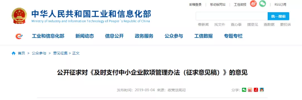 日前从工业和信息化部网站获悉,为了促进国家机关、事业单位和大型企业及时支付中小企业款项,维护中小企业合法权益,根据《中华人民共和国中小企业促进法》等法律,工业和信息化部起草了行政法规《及时支付中小企业款项管理办法(征求意见稿)》(以下简称《征求意见稿》),现向社会公开征求意见,请于2019年10月7日前反馈意见。