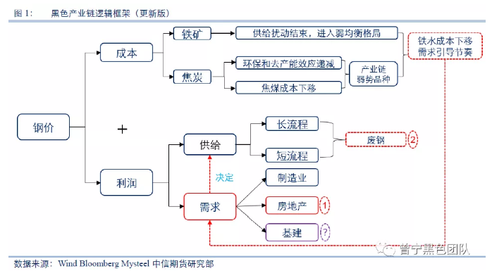 回顾:为何我们认为“废钢”和“终端需求”是驱动产业链的核心?在钢材产业链中,铁矿将进入弱势均衡格局中,焦炭在焦煤成本下移而环保和去产能效应递减的背景下将成为产业链当中最为弱势的品种,铁水成本总体将呈下移的态势,其节奏将由终端需求和利润引导。钢材的供给同样将主要由终端需求和利润来引导,而不管在长流程的废钢添加还是在电弧炉的废钢消耗,废钢都是高成本的铁元素,废钢价格的变化将成为影响钢材供给最为关键的逻辑。因此,总体来看,终端需求和废钢这两者就成为影响产业链逻辑变化最为关键的变量。