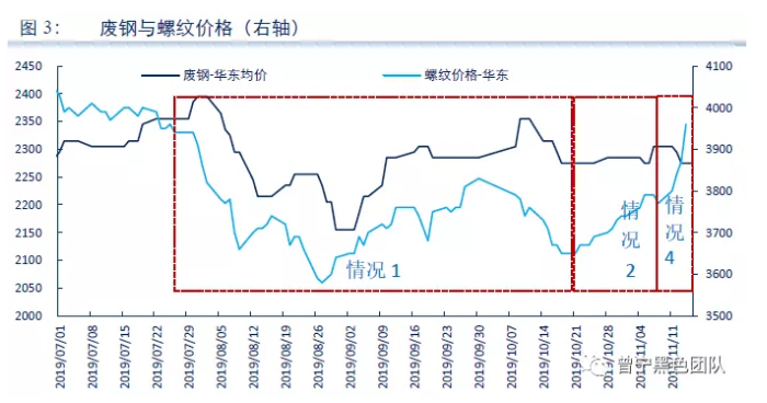 在废钢整体坚挺的背景下,需求的阶段性强弱将成为市场的主导因素,我们进一步根据废钢和终端需求的阶段性强弱,以及废钢和螺纹之间的相对强弱对市场的影响进行分解: