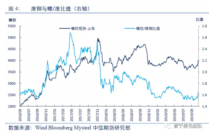 从废钢和螺纹之间的历史价差关系来看,在上涨阶段往往是螺纹强于废钢,这就使得电炉钢利润将重新扩大,供应将滞后回升,最终将改变供需关系,钢价则将呈先扬后抑的形态。