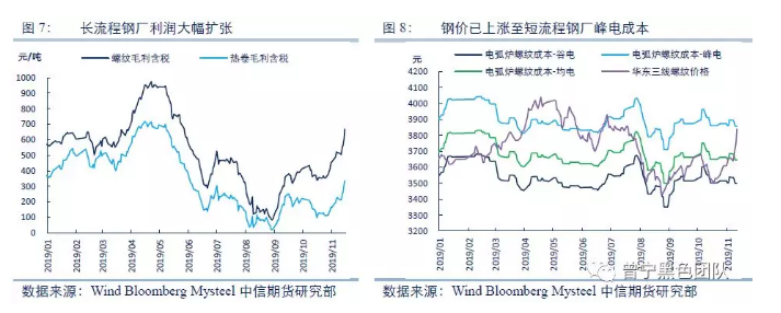 由于下跌期间废钢往往坚挺,而总体上来看,钢厂在废钢价格的主导权上较强,在上涨期间,废钢的表现则往往不如螺纹,这种情况出现较少。一旦出现这种情况,在终端需求强势的背景之下,废钢强于螺纹将使得电炉亏损扩大,进一步使得市场供不应求,钢材价格将处于异常强势的状态。