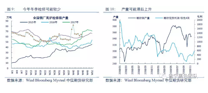 而从长流程来看,在如此高的利润之下,钢厂势必将提高产能利用率。特别是在今年的十一由于大规模环保停产,大量钢厂趁机检修,今年冬季的检修量可能较少,今年很可能是带着高产量进入淡季。从利润到产量的传导存在一个月左右的时滞,而一个月之后正是需求开始真正季节性走弱的时间。如此,钢市将面临新一轮供需错配。