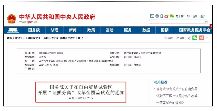 文件名称:国务院关于在自由贸易试验区开展“证照分离”改全覆盖试点的通知国发〔2019〕25号;