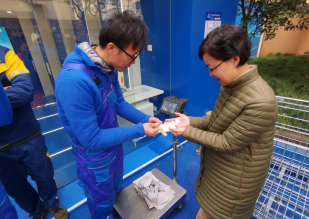 11月29日上午,两网融合示范点“净空间”正式投入运营,穿着蓝色服装的工作人员、蓝色标识的智能自助交投机、经检验合格的计量衡器等全部上岗就位,成为社区的一道亮丽风景线。