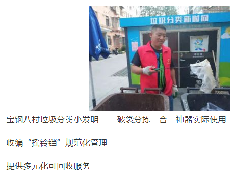 不到一个月的时间里,宝钢八村就出现两个垃圾分类“神器”。2019年6月14日,宝钢八村内由上海宝谊环境卫生服务有限公司陈华发明的第一个“破袋神器”,瞬间风靡全上海。