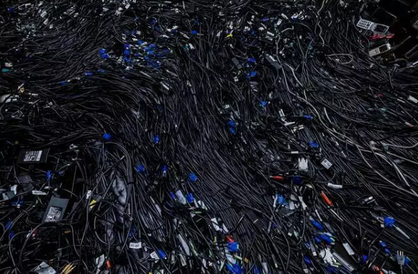 手机形成的假山就像岛屿一样从盘旋的黑色电脑线缆的海洋中升起。数英里长的电脑线缆密密麻麻的捆扎在一起形成了一个球体。